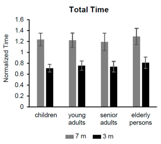 Total time of iTUG test. Non-dimensional normalized time of the four groups to complete the iTUG test over 7 and 3 m.