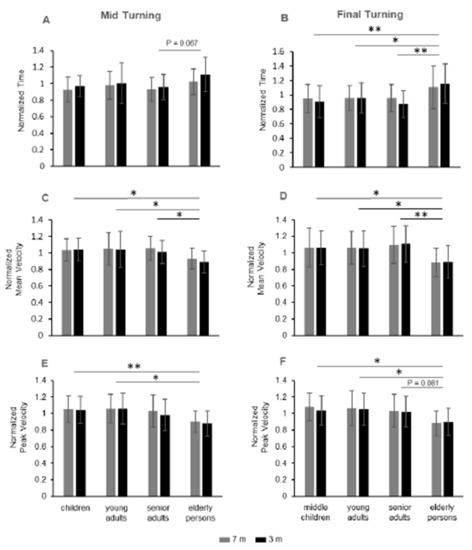 For the mid turning peak velocity (Figure 3E), the elderly group showed no significant differences with respect to senior adults (p = 0.148), but their peak velocity was significantly lower than in young adults (p = 0.015) and in children (p = 0.008). For the final turning peak velocity (Figure 3F), the elderly group showed marginally significant differences with respect to the senior adults (p = 0.081), but their peak velocity was significantly lower than in young adults (p = 0.015) and in children (p = 0.015).
