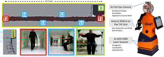 The work presented here was part of the research project ROGER (RObot-assisted Gait training in orthopEdic Rehabilitiation) [7] in which we developed a rehabilitation robot assisting patients to recover their physiological gait after an orthopedic surgery. After the surgery, the patients were encouraged to perform self-training consisting of walking exercises in an aisle of the hospital. But self-training is only effective if the patients are corrected immediately when they deviate from the physiological gait pattern, or are given positive feedback when they walk without incidents. To this end, the robot has to accompany the patients during their self-training and analyze the gait in real-time. Thus, it has to keep a desired distance between 2.5 and 3.5 m in front of the patient in order to keep the subject in the field of view of a RGB-D camera. While the actual analysis of gait patterns is based on skeleton tracking with the Kinect2 RGB-D camera [8,9], the focus of this paper is on the peripheral perception of persons needed for appropriate robot navigation. The hospital is a crowded public space with lots of bystanders, requiring not only a detection of persons in image space, but a consistent model of the 3D positions and properties of all persons in the robot’s vicinity. The limited field of view of the Kinect2 camera is not sufficient for that purpose. Furthermore, it is pointing opposite to the driving direction. Thus, it is necessary to realize a data fusion for several sensors comprising laser range finders and wide-angle cameras (see Figure 1). For this fusion, the individual characteristics of the detectors have to be considered. Laser range finders allow for exact position measurements, but suffer from a high number of false detections, while image-based person detectors have fewer false detections but more uncertain 3D position information. The proposed system solves this problem by probabilistically modeling the detector’s characteristics.