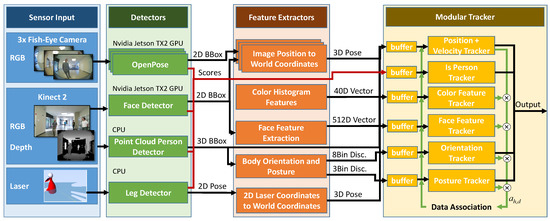Our tracking system can be categorized as a tracking-by-detection approach. On the images of three fisheye cameras, covering a 360° view around the robot, along with the RGB-D data of a Kinect2 and the SICK laser range finder data (see Figure 1), we apply individual detector modules, as shown in Figure 2. The detector modules operate in the domains of their respective input data (image space, point cloud, or 2D plane) producing person detections with a certainty that is expressed in a score. The detection score is transformed into a probability that a detection represents an actual person (called IsPerson probability in the following) by analyzing the resulting detection rates over the scores on a representative test dataset [22]. This probability is used for an adequate consideration of the individual detectors’ false detections and miss rates. Based on the raw detections in the images and point cloud, a set of feature extractors is applied in a second stage. From the detected image regions of presumed persons, these algorithms extract probability distributions of attributes to be tracked in the tracker modules. Finally, the asynchronous streams of these feature detections are sent into the modular tracker, where they are buffered and sorted by the timestamp of the original sensor readings. The tracker itself is responsible for modeling the current state of the persons based on the observations of the past. To keep the system extendable, the tracker is organized in independent modules which can be exchanged without interfering with other modules. In other applications, different attributes might be important, and thus, can be plugged in easily. The data association is done in the core of the tracker, making it possible to use additional information from the other attributes for identification of the hypothesis that belongs. In the following sections, our system will be explained in more detail.