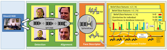 Therefore, at short distance, we use the more distinctive facial features. They are extracted from the full-resolution HD color image of the Kinect2. For each face detected, we extract a feature descriptor by applying a deep neural network following the SphereFace approach [29]. Figure 3 shows that step in the center. The basic idea of SphereFace is to train a network for descriptor extraction by choosing a network topology with a bottleneck, which later becomes the descriptor, and formulate the training as classification with additional restrictions. The network architecture is ResNet-like with 20 convolutional layers followed by the bottleneck of 512 neurons and a softmax classification layer with one neuron for each person in the training set. After training, the classification layer is dispensable, and thus, is dropped. This initial training step is performed offline on the large CASIA-WebFace dataset [30]. It contains face images of different persons. Due to the information bottleneck in the trained network, the feature extraction generalizes well to persons that have not been observed during training. The resulting generic face descriptor is a 512-dimensional vector that can be compared to others by means of the cosine similarity. The descriptors are trained to some degree, being invariant against changing head orientation and environmental conditions, but trials in our application environment showed that representing a person by a multi-modal model is necessary if illumination conditions change drastically along the movement path of the person. Section 5.3 describes that solution in more detail.