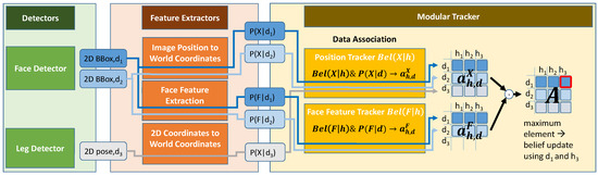 The key element of our implementation is a shared set of unique Hypothesis IDs (HID) used in each of the individual tracker modules. This allows one to calculate a joint association probability of a new detection d and hypotheses h in the tracker (see Figure 4). This binary probability is computed in the individual tracker modules based on their current belief for the respective HID h which is compared to the respective detection distribution. In order to be able to combine information of different feature extractors and detectors, the raw detections and features extracted from them get assigned a unique identifier called Detection ID (DID) d. Together with the commonly used HIDs h, this allows one to multiply the association probabilities concerning a specific d and h from different tracker modules. For example, the association of a face detection in an image can have two supporting tracker modules, the position and the face features voting either for or against a match. There are also detections that do not have additional support from other modules, such as the leg detections. For those, no additional features are computed and tracked; thus, an association is only based on position. The binary association probabilities of all modules m get multiplied in Bayesian manner: