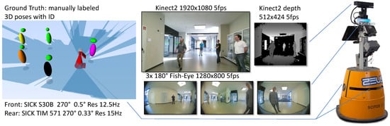 For benchmarking, we used our multi-sensor dataset that has been published in [22]. The sensors used were the Kinect2, three fish-eye RGB cameras, and two SICK laser range finders as shown in Figure 5. The data comprise five guided tours in a public building similar to the hospital. In each of the trials one person followed the robot, while up to six additional persons walked around randomly. The dataset has been labeled manually, such that for each frame the ground truth position and orientation of the visible persons is known. For actual calculation of the online tracking results, the records have been replayed on the actual hardware of our target robot and all detections have been processed in real-time.