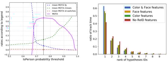 Left: Evolution of MOTA values with different existence thresholds. While higher thresholds lower the amount of false positives and ID switches, the amount of missed hypotheses increases. The threshold with the highest MOTA determines the best working point for our tracker in the application phase (vertical black line). Right: Sorted histograms for hypothesis IDs assigned to ground truth IDs. Colors indicate different combinations of features used. It can be seen, that by using more complex features, the values in the first bin almost doubles compared to a tracker without re-identification features. This first bin reflects the proportion of time a person has the correct ID, even if s/he has left the field of view in between. This is important for a robust re-identification of the target user in our gait training application.
