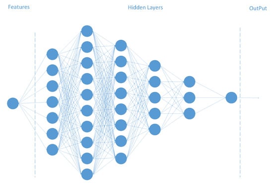 In the deep learning algorithm for DNS behavior analysis and evaluation, we generate a 6-layer fully connected neural network with each layer at 7, 10, 8, 5, 3, and 1 (see in Figure 3). The data we input is a set of 8-dimensional feature vectors with serial numbers. After removing the first column of numbers representing the relationship between IP and domain, we get the 7-dimensional vector. So, we generate seven neurons when building the input layer. We want the output to be a one-dimensional label matrix. We believe that the closer the value is to 1, the more suspicious the DNS behavior is.