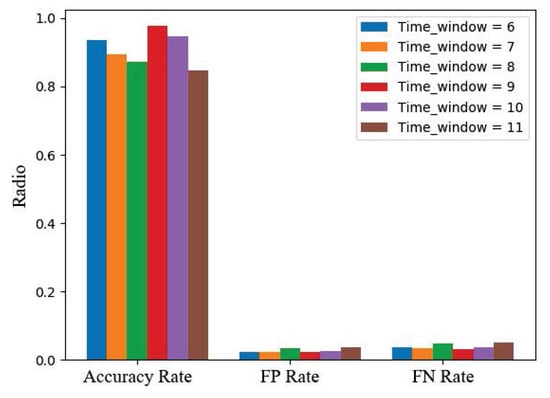 In order to judge the rationality of our parameter selection, we up-regulate and down-regulate the parameters of the time window(see in Figure 4) in the feature vector. We also attempt to change the learning rate in a model of a fully linked neural network. First, we adjust the time window between 6 and 10. We select the appropriate time window based on the accuracy rate. We find out that the time window at the value of 9 would be appropriate. After the reprocessing of the data, the experiment results show that the false positive rate is about 2.3%, the false negative rate is about 3.1%, and the accuracy rate is 97.6%. We find that after this parameter adjustment, the false positive rate has a slight increase, and the false negative rate just changes a little.