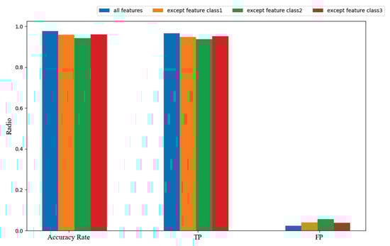 In Figure 5, the x-axis represents the number of iterations of the training and the y-axis represents the loss rate of our model. In order to further determine the validity of our feature set, we eliminated three feature sets consisting of the feature classification methods proposed in Section 4 to perform verification experiments. The experimental results, as shown in Figure 6, demonstrate that the features we propose are valid.
