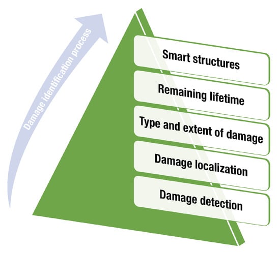 In general, SHM developments can be classified into two large groups [30]: model-based approaches and data-driven approaches. In the first type of approach, theoretical information or data acquired from the structure are used to build a mathematical or physical model to predict the behavior of a structure in different scenarios and with different variations in operational and environmental conditions. Model-based approaches make frequent use of finite element analysis (FEA) [33]. The second approach to damage identification relies on the analysis of data acquired directly from the structure. In general, this analysis can be performed under the pattern recognition paradigm [30]: that is, data obtained from the healthy structure are used to build a pattern and data from the structure during the inspection process are used to determine its current state by comparing some features obtained from the inspection data with the baseline. Both types of methods—model-based and data-based—can be applied at every level of the damage-identification process in Figure 1. This means that, currently, there are different strategies that consider a single level or multiple levels of the damage-identification process. Implementation at particular levels delivers specific results that may be the end of the process, depending on the application. It is also possible, for example, to build a solution of which the intended scope is limited to the detection and location of damages. In other cases, the expected scope is related to the implementation of the first four levels, thus determining the remaining useful life of the structure under inspection. However, it is clear that all levels present an incremental approximation since the implementation of a particular level requires the performance of the previous levels in the pyramid in Figure 1.