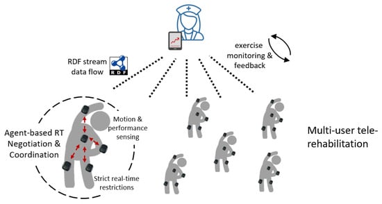 As it has been described in [12], a number of functionalities are needed in this type of digital rehabilitation scenarios, including tools and methodologies for supporting: (i) adherence to the treatment; (ii) monitoring of performance and correctness of the movements; (iii) enabling adjustments, management of errors and compensations; (iv) coaching, encouraging and motivation of the patient; (v) providing motivation, commitment and fatigue measurements; and (vi) incorporating practice-specific parameters. Multi-agent systems have provided relevant contributions to all of them [43], although breaching distributed sensing in real-world applications is still an open challenge. The usage of affordable wearable sensors is essential to allow monitoring and in-time feedback in digital rehabilitation scenarios. Indeed, a previous work [12] elaborated on the employments of MAS for telerehabilitation, proposing a theoretical model and relevant future steps to undertake. Undoubtedly, the success of digital rehabilitation will also require the integration of diverse sensing technologies and semantic compatibility. Although the question of sensor data heterogeneity has been addressed in past years, with promising results regarding the inclusion of ontology-based approaches for stream processing in IoT environments, the integration of these methods with real-time compliant technology remains mostly unexplored. Essential challenges in this respect include the addition of real-time constraints in existing models such as RDF stream processing, or the representation of behaviors and negotiation using semantic technologies.