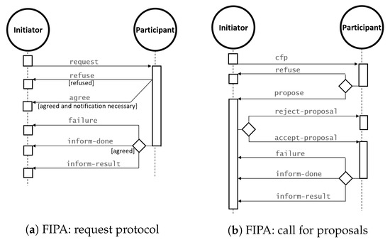 RSP agents interact with each other in a structured manner, through protocols based on existing standards for multi-agent cooperation, negotiation, and delegation. Among these protocols, we focus on those defined by FIPA [47]. In Figure 3 depicts two examples of standard FIPA negotiation protocols. Figure 3a represents a request for a given task/data from a given initiator to a given participant. This latter can accept or refuse the request. If the answer is positive and the initiation awards the task execution, the participant will start performing it.