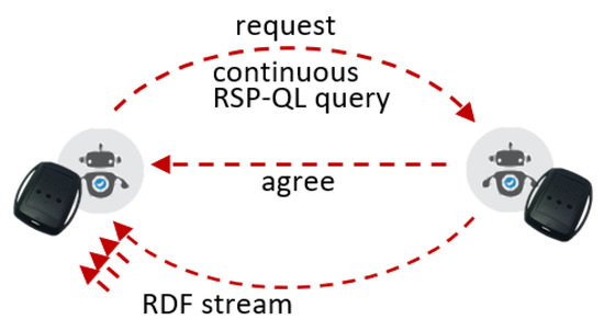 Simple request interaction between two sensor agents: continuous RDF Stream Processing (RSP) query. This interaction can be embedded into a FIPA request protocol, with the addition of a continuous set of final responses instead of a single one. The continuous query will expect multiple responses until the query is canceled or its execution expires.