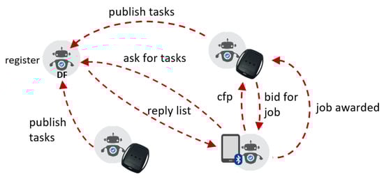 - Smith, R.G. The contract net protocol: High-level communication and control in a distributed problem solver. IEEE Trans. Comput. 1980, 1104–1113. [Google Scholar] [CrossRef]