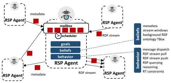 RSP agents architecture. Each agent encapsulates beliefs, goals, and behavior, and manages incoming messages through its mailbox. The execution of real-time constrained tasks is governed by an internal scheduler, and the constraints themselves are included in the agent behavior. Ontologies and vocabularies are included as part of the agent beliefs or knowledge, as well as the contents of dynamic stream that the produce/consume. Interactions among RSP agents happen through RDF message exchange of either metadata or continuous RDF streams.