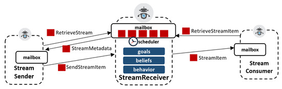 As described in the model, each RSP agent encapsulates a set of beliefs, goals, and behaviors, and interacts with other agents exchanging messages and streams of data through its inbox. Each agent may act as a sender or receiver of two main types of messages: