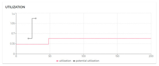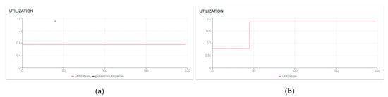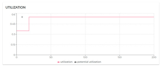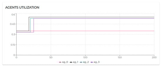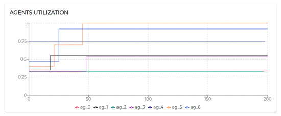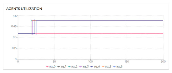 In this paper, for simplicity, we consider the case of simple behaviors, referred to as tasks. One particular task model is named periodic tasks (i.e., tasks whose execution recur endlessly after a fixed period T) [46]. Besides the period T, and relative deadline D this model of task also includes information such as the release time R, and computation time C (typically a worst-case estimation). To guarantee compliance with strict-timing constraints, the agent local scheduling algorithm evaluates the feasibility of its task-set based on the related utilization factor. In particular, the utilization factor of a given task (periodic behavior) b in a task-set is computed dividing its computation time by its period (when period is equal to deadline: ). Therefore, the utilization factor of a given agent at a given time t is defined by