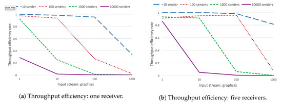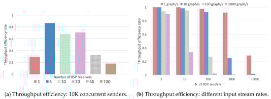 In the first set of experiments, we measured the throughput efficiency, for different input stream rates (1, 10, 10, and 1000 graphs/s), and a different number of concurrent senders, and a single receiver (Figure 21a).