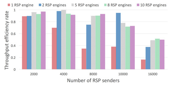 In the next experiment (Figure 23), we evaluate a similar scenario, but this time, adding CQELS RSP instances (1, 2, 5, 8, and 10 concurrent engines). The results are shown for different numbers of RSP concurrent senders (2000, 4000, 8000, 10,000, and 16,000). For very high input loads, the system is still capable of at least 0.5 efficiency. It is clear that at this point, a cluster deployment would be required.