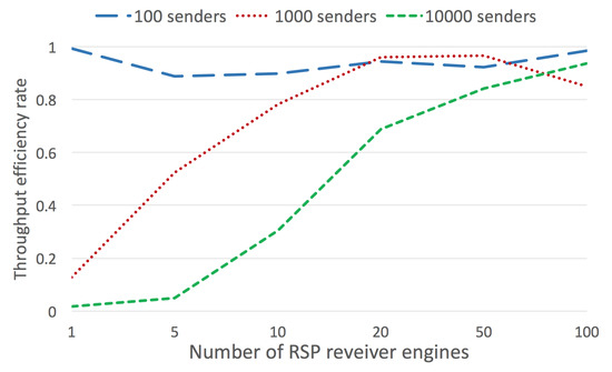 Throughput efficiency vs. number of RSP senders, for different numbers of RSP receiver engines.