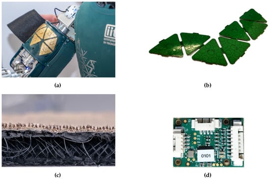 (a) Main components of the iCub skin. (b) Array of capacitive sensors. Each sensor implements 12 taxels and hosts the capacitive transduction electronics. (c) Deformable dielectric with conductive top layer. (d) Micro-controller tactile board (MTB).