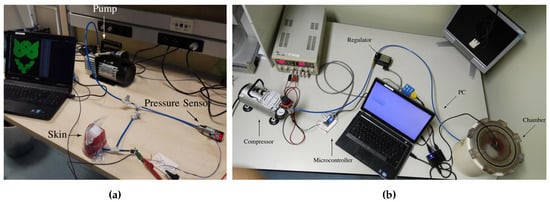 - The first setup (Figure 3a) consists of inserting the skin inside a Ziploc bag and pumping out air. This decreases the pressure in the bag and creates a uniform pressure distribution over the skin surface. The flow rate is regulated by using valves to ensure a slow and steady pace in order to avoid the dynamic effects of the dielectric material. The pressure reached on the skin is measured with a pressure sensor that sends data to a computer through a CAN network [].