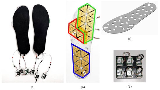 (a) Insoles prototype. (b) Inner part of the insole containing the gaps that accommodate the digital converter integrated circuits. (c) Computer-Aided Drafting (CAD) design of the support for the electronics. (d) Micro-controller tactile boards (MTBs) consistency: one for each patch of the insoles.