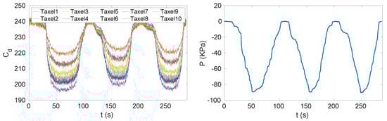 Figure 6. Capacitances measured by one triangle (i.e., 10 taxels) and pressures measured by the pressure sensor during the vacuum bag experiment that consisted of three cycles of pressure reduction and increase. - Another data set was taken using a pair of sensorised shoes developed at IIT (Figure 5b). Each shoe was equipped with two six-axis FT sensors by the iCub group at Istituto Italiano di Tecnologia (IIT) [], able to measure the forces and moments. As mentioned in Section 3.2, the data sets had different features in order to excite the activation of the taxels as much as possible in order to obtain different combinations to cover the entire capacitance range of each sensor (Figure 7).