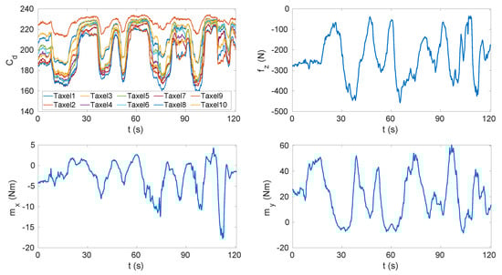 Figure 7. Capacitances measured by one triangle (i.e., 10 taxels), vertical force and horizontal moments measured by the sensorised shoes.