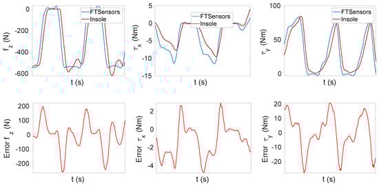 Figure 10 shows a delay of the insole estimation with respect to the FT sensor measurements (samples of FT sensor data sets and insole data sets were synchronised over time based on the receiver timestamp). This delay caused a very large error during the transition phase of up to 200 N.