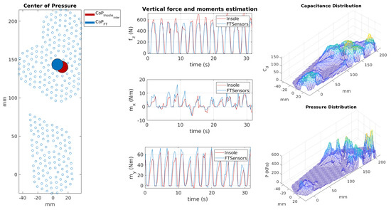 On the left, the figure shows the comparison between the centre of pressure estimated from the FT sensor data and that estimated by the insole. In the middle, the graph contains the comparison between vertical contact force and horizontal moments estimated through the FT sensors and the insole, respectively. On the right, the capacitance distribution is given by the taxel measurements and the pressure distribution was computed using the coefficients estimated during the calibration phase. For visualisation purposes, the estimated forces and the pressure distribution are positive. The insole is very sensitive and thus the measured capacitance values were not equal to the rest value even when there was no weight on the foot. This is due to the contact between the foot and the insole, which becomes strong when the shoes are strapped. To avoid considering fake pressures, we used a threshold on the measured capacitance values set to 30. Furthermore, the pressure values were interpolated over the entire insole surface in order to obtain a more accurate estimation of the pressure distribution and the CoP. Additionally, the capacitance values were interpolated to visualise the capacitance distribution. A video of the online visualisation tool is provided to show the results of the validation in real time.