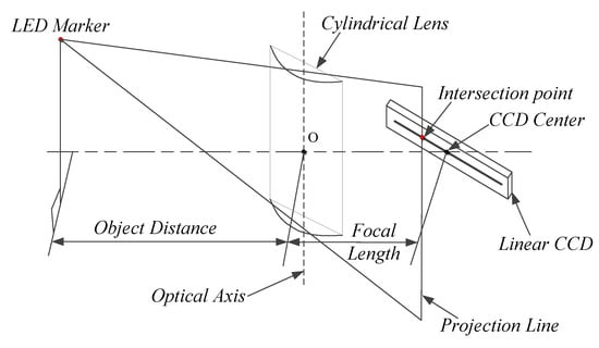 As shown in Figure 1, a linear CCD and a cylindrical lens constitute a one-dimensional imaging unit (ODIU); the light from the light emitted diode (LED) marker passing through the cylindrical lens will focus to a line which is coplanar to the marker and optical axis of the lens [25]. To detect the change of plane due to the movement of an LED marker, a linear CCD is used, and it is located at the focal plane of the cylindrical lens. This linear CCD is placed perpendicular to the optic axis of the cylindrical lens to detect the change of the projection line when the LED marker moves. The center of the linear CCD is aligned with the center of the optic axis, and their distance is the focal length of the cylindrical lens.