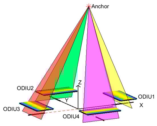 As we know, a plane can be defined according to a line and a point that is not on that line. In order to determine the 3-D coordinates of a LED marker in the coordinate system, we need at least three ODIUs to register the LED marker’s 1D image position coordinates, and then reconstruct the 3D spatial coordinates of the anchor [26]. However, with the system composed of only three ODIUs, although it can provide the 3D coordinate information reconstruction of one marker, nevertheless, this system is vulnerable if any ODIU breaks. To make full use of the layout of the existing symmetrical structure on the mobile agent, such as a quadrotor drone who has four arms, we will use four ODIUs to determine the 3D coordinates of an anchor. Meanwhile, it is a redundant system by using four ODIUs, even if an ODIU malfunction, the whole system can still work normally.