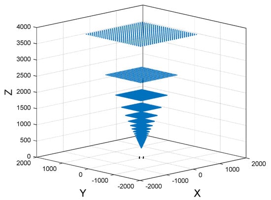 According to Table 1, we divide the photosensitive area of the four linear CCD every 1 mm to choose the projection line, and there will be many spatial intersections. Here we consider the case that the calculated z value of the spatial intersection below 4000 mm. Figure 4 is the simulated FOV of POS according to the parameters in Table 1.