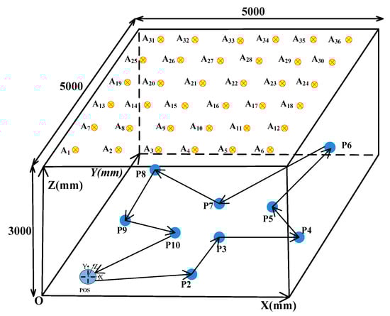 As shown in Figure 5, the dimension of the system model is 5000 mm × 5000 mm × 3000 mm. Thirty-six infrared LEDs are fixed on the ceiling as anchors. Meanwhile, their coordinates in ICS are shown in Table 2.