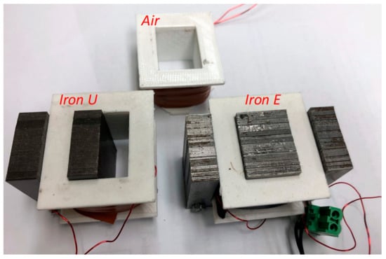 The sensors used in this work were manufactured with a rectangular shape and comprise 200 turns of copper wire. The coils were placed in similar dielectric supports. Then at a second stage, the three individual coils were further discriminated by the use or not of an iron core. The first coil formed a coreless flux sensor. For the other two sensors, the coils were mounted on iron cores, with U and E shapes, respectively. The iron cores were built by standard magnetic steel laminations used in small transformers. The sensor coil supports are shown in Figure 1.