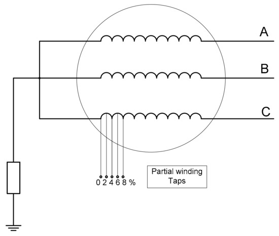 In Figure 4 and Figure 5, the electrical connection schemes of the stator and rotor are shown, respectively. The stator phase C has partial windings taps, which make it possible to perform inter-turn faults of variable severity in the stator (Figure 4). Additionally, the salient pole connections were reachable through a hole in the shaft, so inter-turn rotor faults of varied severity could be emulated by the use of the variable fault resistance RF (Figure 5).