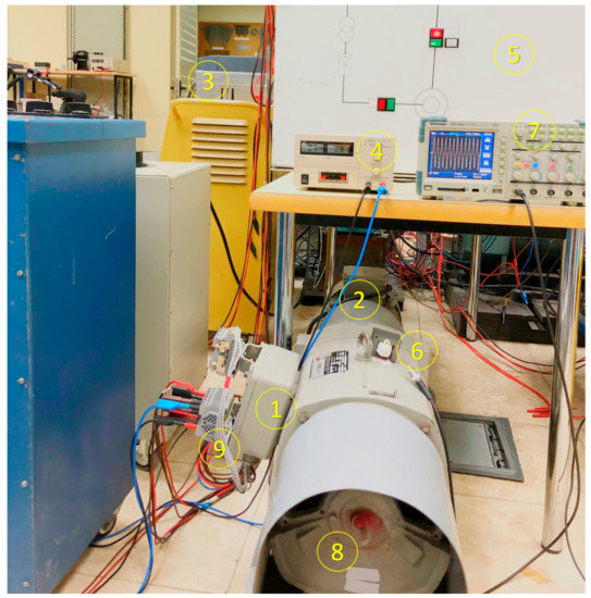 Experimental setup. (1) Synchronous machine, (2) asynchronous motor, (3) frequency converter, (4) DC-adjustable voltage source for excitation, (5) connection panel with synchronizer, (6) iron core E-type flux sensor, (7) oscilloscope, (8) pole connections and (9) stator tap terminals.