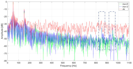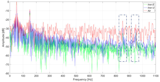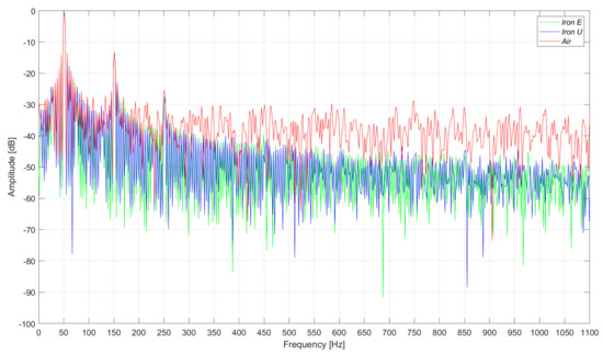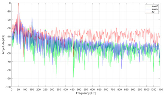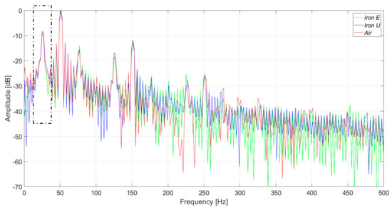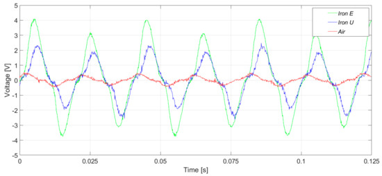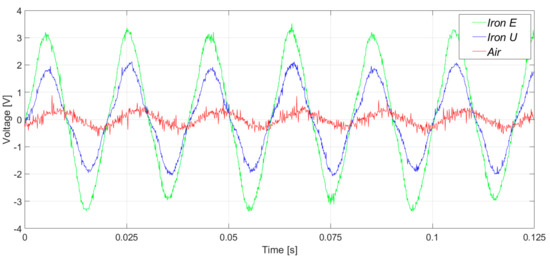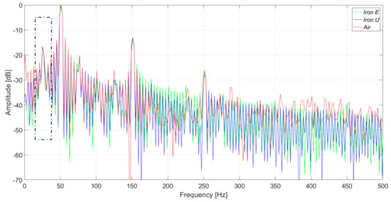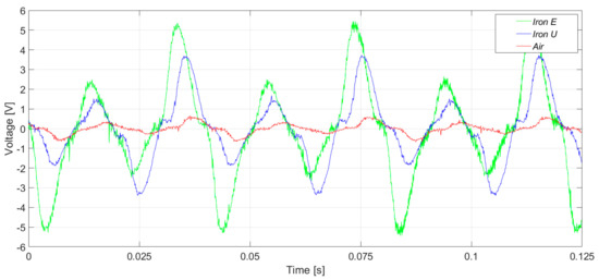 From Table 3, it can be clearly seen that the 25 Hz component could be detected by the three sensors. Furthermore, the amplitude differences between the fundamentals at 50 Hz and the 25 Hz signatures were similar. However, the induced voltage amplitude in the iron core E shape was eight time greater than in the case of the air core.