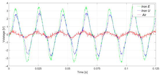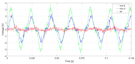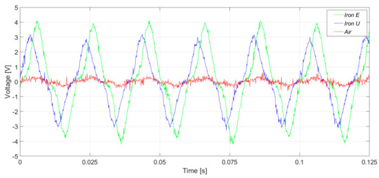The stray fluxes in the three sensors were different. In the case of the air core sensor, the stray flux was not distorted in any way. On the other hand, the iron cores increased the magnetic flux density due to the low permeability of the new flux path. Consequently, the sensors’ output voltage amplitude was significantly greater with iron core sensors.