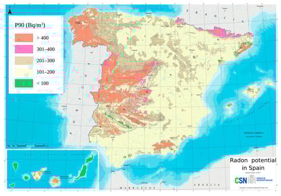 In Spain, the pioneering studies regarding the taking of environmental measurements date from the end of the 1980s []. These studies highlighted the high concentrations of radon in several regions, including, among others, Galicia.