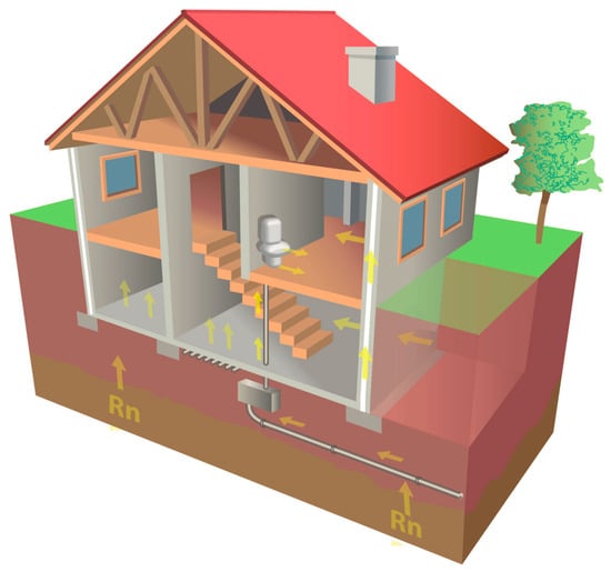 In indoor air, for example at home, schools or in office buildings, radon levels and their progeny are generally higher than outdoors. The fluctuations are important but can range from 10 Bq/m3 to 10,000 Bq/m3, according to reports from the World Health Organization []. The type of construction can affect radon levels; however, there may be high levels of radon in homes of all types—old or new homes, homes with air currents, homes with insulation, and homes with or without a basement. With radon having a higher density than air, its concentration is higher the lower the height of the house compared to the upper floors. Atmospheric conditions, local geology, building materials, ventilation habits, and the way housing was built are some of the factors that affect radon levels in homes [,].