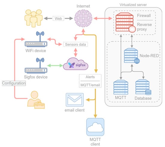 Currently, the system’s sensor devices use two different communication technologies—WiFi and Sigfox—but we plan to incorporate and test more communication technologies in the future. When securing the communication paths, each technology has different requisites, but we tried to create a system that could be secured as independently as possible from the communication technology used.
