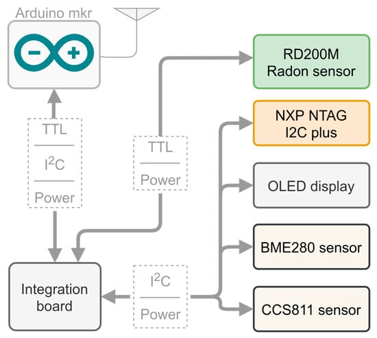 Sketch of the devices developed: processing unit and antenna, integration board, RD200M radon sensor, OLED screen, NXP NTAG I2C plus, CCS811 sensor and BME280 sensor.