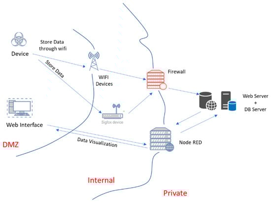 Given that high radon concentrations cause health problems [], we needed to secure our system to minimize either attacks or their effects. Figure 6 represents the main parts of our system, the data flow between them and how they are located in the different areas of the communication network. The more critical devices are included in more restricted areas. Two elements centralize and secure the access to this private zone: the pfSense node and the processing node (based on Node-RED as previously explained). In the following paragraphs, we explain the possible problems the system could face and the security approaches we used in the different layers.