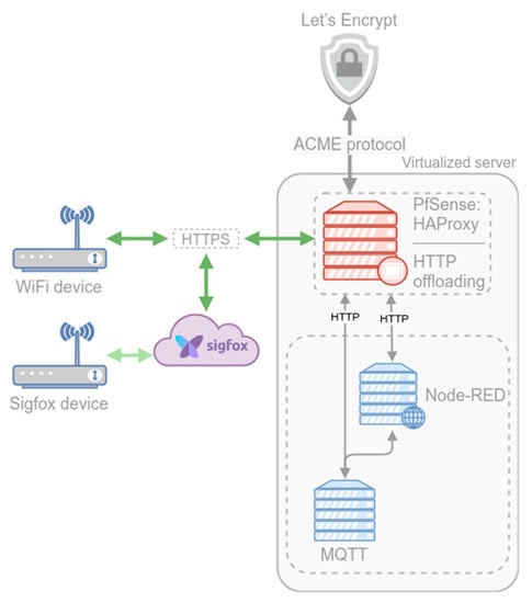 We want our system to use HTTPS for communication, so both endpoints have to be able to use SSL to encrypt the data using certificates (devices and backend). There are two nodes in the backend where we could encrypt the communication: in the pfSense node or the Node-RED node. We chose to use the former via the load balancer (HAProxy), using the technique known as SSL offloading. This relieves the Node-RED server of the processing burden of encrypting and decrypting traffic sent via SSL, freeing its resources to process data. The processing is offloaded to the pfSense server that encrypts the communication with the devices while using non-encrypted communication with Node-RED (the communication between HAProxy and Node-RED takes place in the Proxmox virtual network, so it does not need to be additionally secured).