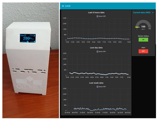 The main objective of this work was to create a secure and low-cost radon monitoring and alert system, based on open source technologies to prove its feasibility. We achieved this objective by creating devices, a collection of radon level, temperature, pressure, humidity, and air quality sensors with a processing unit and a communication module, integrated using a 3D printed case (see Figure 9 left, where the assembled device is shown), and a backend, a collection of servers responsible for managing all the information the devices collect, predicting radon concentrations, issuing alerts if a high radon concentration is predicted, and showing the data and alert status on a web (see Figure 9 right).