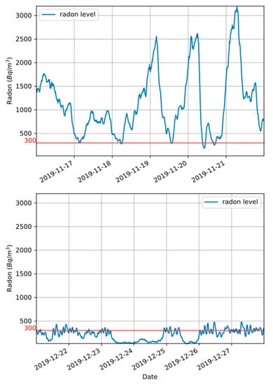 The system was created to inform, using alerts, that a high radon level is predicted for a given location. This enables taking action to avoid future high radon levels. Currently, the action has to be taken by a human operator. This action is usually opening a window or turning on an airflow control system. Figure 10 shows the radon levels in two scenarios for the same location. This location was used as one of our testing sited due to its particularly high radon concentration. In the first scenario (Figure 10 up), the alert system was not activated—the system just stored the radon measures, showing the natural radon level of the testing site. In the other scenario (Figure 10 down), the alert system was activated and a human operator was in charge of turning an airflow control system on or off (with each alert/”back to normal” message). Comparing these two scenarios, we can see that the system can satisfactorily be used to significantly lower the radon levels. These results also indicate that the selected radon sensor and the approach used when developing the system were appropriate for the intended usage.