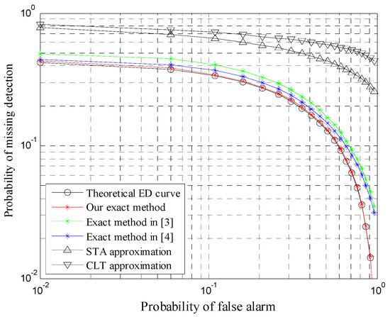 Complementary ROC (CROC) curves of five ED schemes for N = 8 are illustrated in Figure 1. Obviously, the detection performance of our exact method outperforms CLT and STA approximations, especially for the low false alarm probability regime in practical scenarios. Figure 1 also demonstrates that our method is closer to the theoretical ED value than the other two exact methods. The reason lies in the fact that the two exact ED schemes need to require truncation in practice due to the infinite series, which results in some truncation errors. Therefore, our new ED scheme has the best detection performance in practical scenarios.
