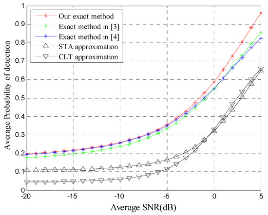 Figure 2 illustrates the behavior of the average detection probability versus the average SNR for N = 12. Obviously, the detection performance of our exact method outperforms the other two approximations since CLT and STA are not accurate, especially for a few of the samples. To some extent, the two exact methods are actually approximations due to truncation of the infinite series. Therefore, the two exact methods are worse than our method in terms of detection performance.
