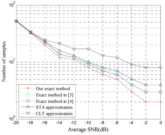 Figure 3 illustrates the number of samples (N) required to achieve and , as a function of SNR. STA matches well the exact result compared with CLT. CLT is accurate only when N is high. In addition, compared with our method the two exact methods have small errors since the infinite series in the two methods needs to be truncated in practice. Therefore, we can conclude that with a small sample size our novel exact method is not only more accurate than the approximations, but more accurate and more practical than the existing exact methods in practical scenarios.