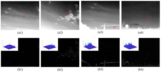 Figure 4 shows the preprocessed results of different images. The upper left image in the second row images is their three-dimensional diagrams. It can be seen when there are few clouds or buildings in the image, the background of the infrared image is effectively suppressed, and small targets can be detected by simple threshold segmentation (as shown in Figure 4(b1,b2)). However, when there are “bright” man-made buildings or trees in the image, some edges of the infrared image are not completely suppressed. If simple threshold segmentation is performed on these images, the residual edges will cause false detection (as shown in Figure 4(b3,b4)). Therefore, detecting the small target accurately in the residual background edge is a critical stage.